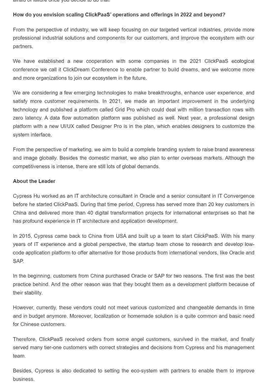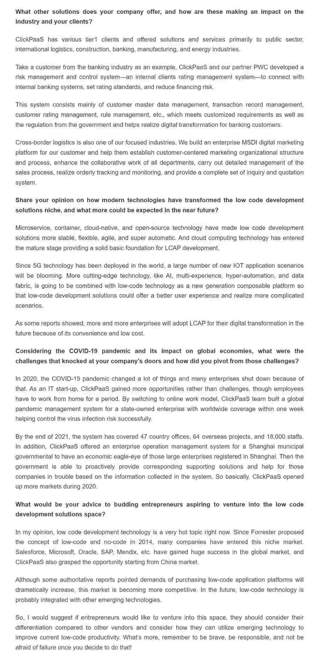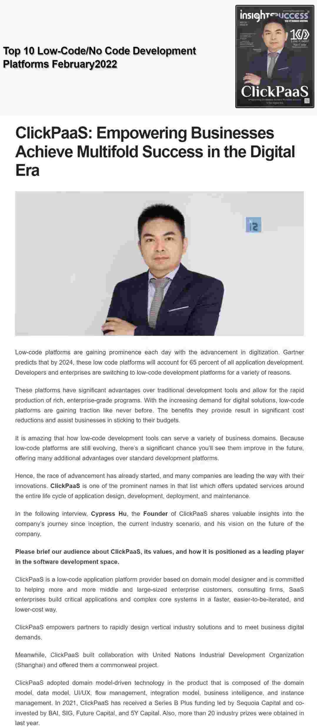 2022年年初,,,,沃钱包入选外媒Insights Success低代码/无代码开发平台 Top10,,,创始人、、、、CEO胡柏受邀接受专访并荣登封面人物,,,他与Insights Success的读者分享了沃钱包成立的初心、、、、发展历程、、、、当前的行业发展趋势以及他对公司未来的展望。。